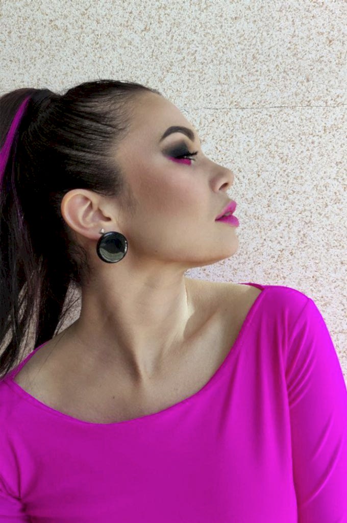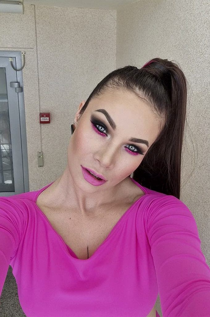 Для данного образа мы предложилияркий и выразительный макияж, который Pin Up прекрасно видно со сцены и который будет отлично сочетаться с костюмами. На глазах мы сделалисмокимакияж, верхнее веко мы накрасили чёрными тенями, нижнее веко выполнили ярко розовыми тенями на стойкий карандаш и сверху дополнили всё блёстками. На губы легла стойкая ярко Pin Up помада.